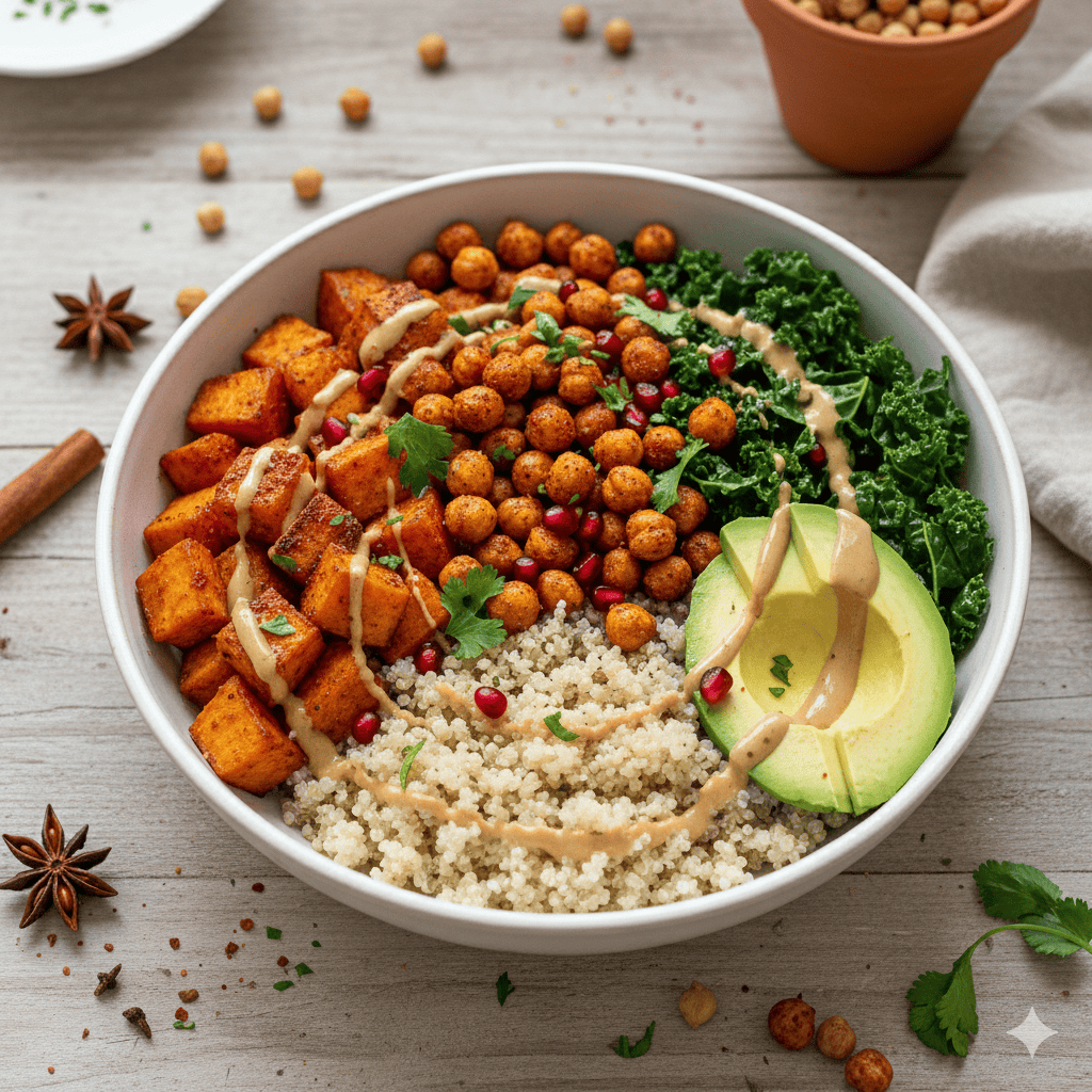 This nourishing Buddha bowl combines spiced roasted chickpeas and sweet potatoes with fresh greens, quinoa, and a creamy tahini dressing.